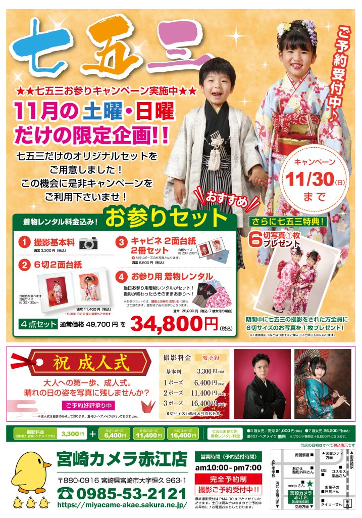 11月の七五三キャンペーン 11月の土日祝日限定で「七五三撮影」に「神社お参り用の着物レンタル(1人分)」がセットになった「お参りセット」を今年もご用意しています。お店で撮影をしてからそのまま着物姿でお参りができるプランとなります。ぜひご利用下さい!(要予約)チラシダウンロード→ Follow me! @miyacameakae