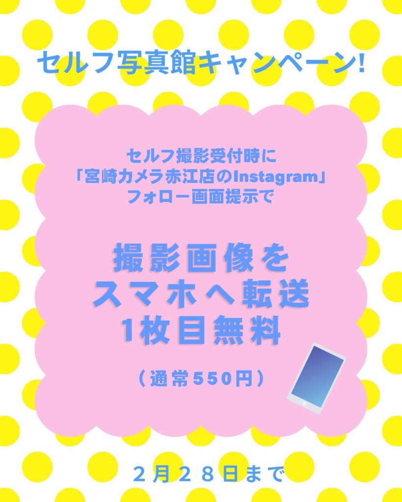 セルフ写真館のスマホ転送が1枚目無料! ご好評を頂いているセルフ写真館ですが、撮影データのスマホ転送もできます。通常は1枚目が基本料込みの550円(税込)、2枚目からは1枚毎に110円(税込)となっていますが、当店のInstagramをフォローして頂く事で1枚目が無料!になるキャンペーンを実施中です(2枚目からは 1枚 110円)。この機会にぜひご利用くださいませ!キャンペーン期間:2026年2月末まで※他のキャンペーンや割引との併用はできません Follow me! @miyacameakae